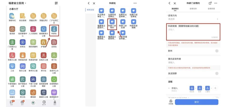 1.点开“钉钉”app→福建省立医院→科研处→科研门诊预约。