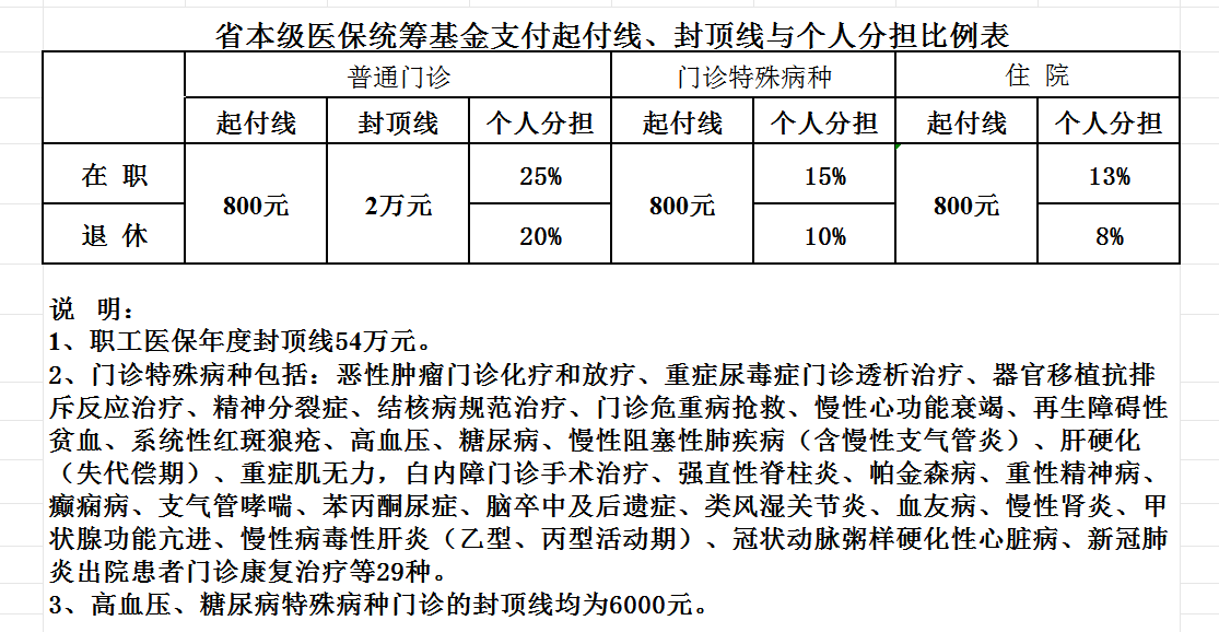 2024年省本级医保统筹基金支付起付线、封顶线与个人分担比例表