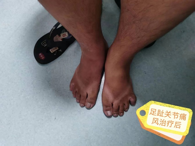 72岁的患者老赵全身多处痛风石,尤其是胳膊肘上的痛风石尤其明显,疼痛发作此起彼伏,就没有消停过;22岁的患者小李,脚趾头也长了痛风石,皮鞋、运动鞋、布鞋都没办法穿,即便冬天出门,也只能穿拖鞋。他们在精心治疗下,痛风石也彻底的溶解消散了,告别了轮椅和人字拖,重新回归了美好生活。