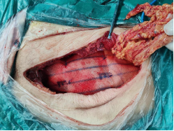 老姚入院后,鉴于该肿瘤恶性度高,杨国华主任医师立即组织肿瘤内科、泌尿外科、整形外科、胃肠外科、病理科等相关学科专家,进行多学科会诊。但目前肿瘤尚未向肝肺转移,且患者对放化疗不敏感,杨国华主任医师给出治疗方案:联合泌尿外科一起切除肉瘤,减少肿瘤负荷,术后补充放化疗,减少局部复发。但新的问题接踵而至——肿瘤切除后,腹壁会有巨大缺损,导致无法关腹。面对如何修补腹壁这一个棘手难题,杨国华主任医师查阅多方资料,凭自已多年的腹壁切口疝无张力修补经验,决定采用“三明治法腹壁修补术”,巧补“拆弹”后的“弹坑”。