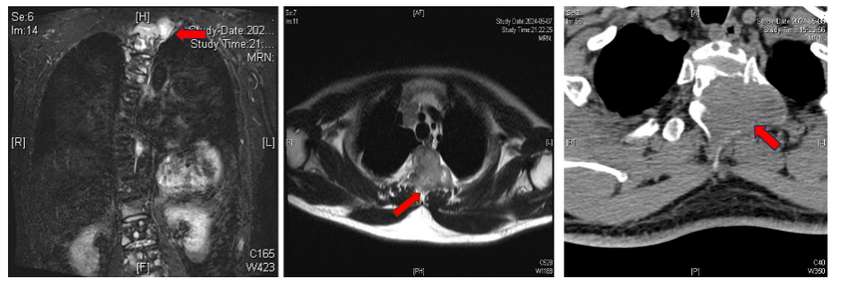徐杨主任医师团队迅速为其安排磁共振、全身骨扫描(ECT)和PET-CT等检查。发现患者下肢瘫痪是因为第1-2胸椎肿瘤压迫脊髓导致的,而且全身其他多处骨质也被转移破坏了,考虑是胸腺癌多发转移。