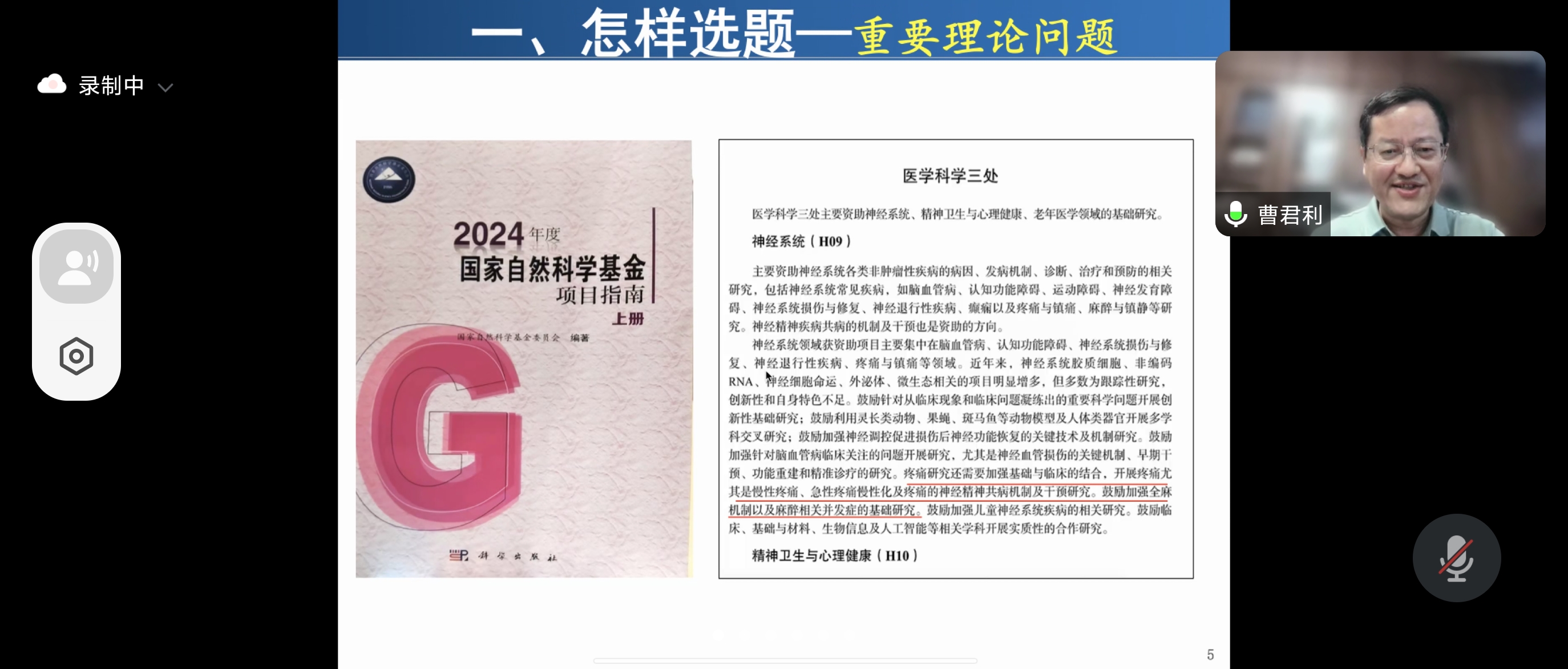 曹教授结合自身多年的科研经历,深入浅出地分享了国家自然科学基金的申报策略和心得,并结合麻醉学科的特点进行了详细的讲解。讲座中,曹教授强调了选题的重要性,他指出,一个好的选题不仅决定了研究的方向和深度,还直接影响到研究成果的价值和影响力。曹教授以麻醉学科为例,深入剖析了包括全麻机制、疼痛学和围术期脑健康等研究的重要问题,并详细介绍了如何将这些科学问题进行分解,找到研究切入点,从而确定研究方向。他还强调了临床医生的优势,鼓励大家将临床现象、临床问题和科学问题相结合,撰写出更具吸引力的标书。