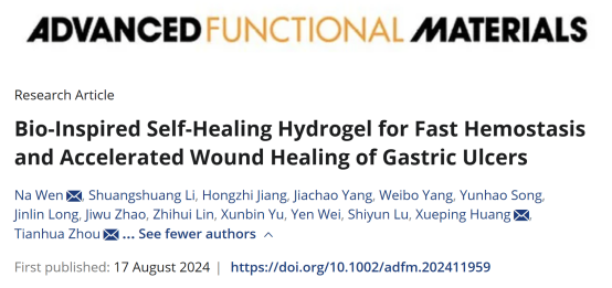 近日,我院消化内科黄雪平副主任医师和福州大学材料与工程学院温娜博士团队合作在国际材料顶级期刊上《Advanced Functional Materials》发表题为“Bio-Inspired Self-Healing Hydrogel for Fast Hemostasis and Accelerated Wound Healing of Gastric Ulcers”( IF:18.5)的重要原创研究成果,引起广泛关注。