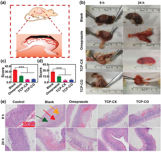 为了应对这一挑战,课题组采用了凝血酶衍生的C末端肽(TCP-25)作为靶向剂,并通过Schiff碱反应将其结合到两种新型可注射且生物相容的羧甲基壳聚糖(CMCs)水凝胶中。TCP-25肽水凝胶在独特的胃肠微环境中表现出最佳的适应性,展示了酸抵抗性和降解性之间的平衡,以及控制释放、生物活性和良好的生物粘附性质。体外和体内实验均显示,该水凝胶能够实现快速止血。在大鼠乙醇诱导的胃溃疡模型中,它证明了水凝胶在24小时内有效抑制胃溃疡出血达92%,其效果超过了常用临床治疗药物奥美拉唑。本研究有希望应用于临床胃溃疡的快速止血和愈合。