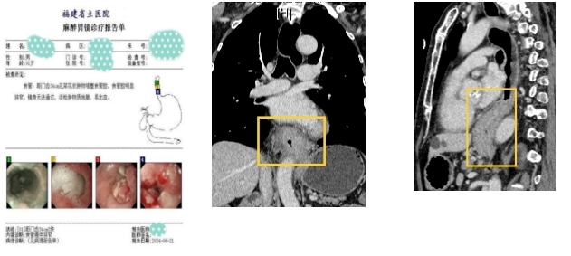 91岁的王依伯,近半年来总觉得自己吃东西的时候被胸口的东西挡住了。他在当地医院挂瓶输液后,不见好转,最近已经发展到完全吃不下饭、只能喝水的程度。家人把王依伯送到了我院金山院区,胸外科徐驯宇主任医师团队接诊后,通过胃镜检查,发现他为食管下段的腺癌,已经出现梗阻的症状。