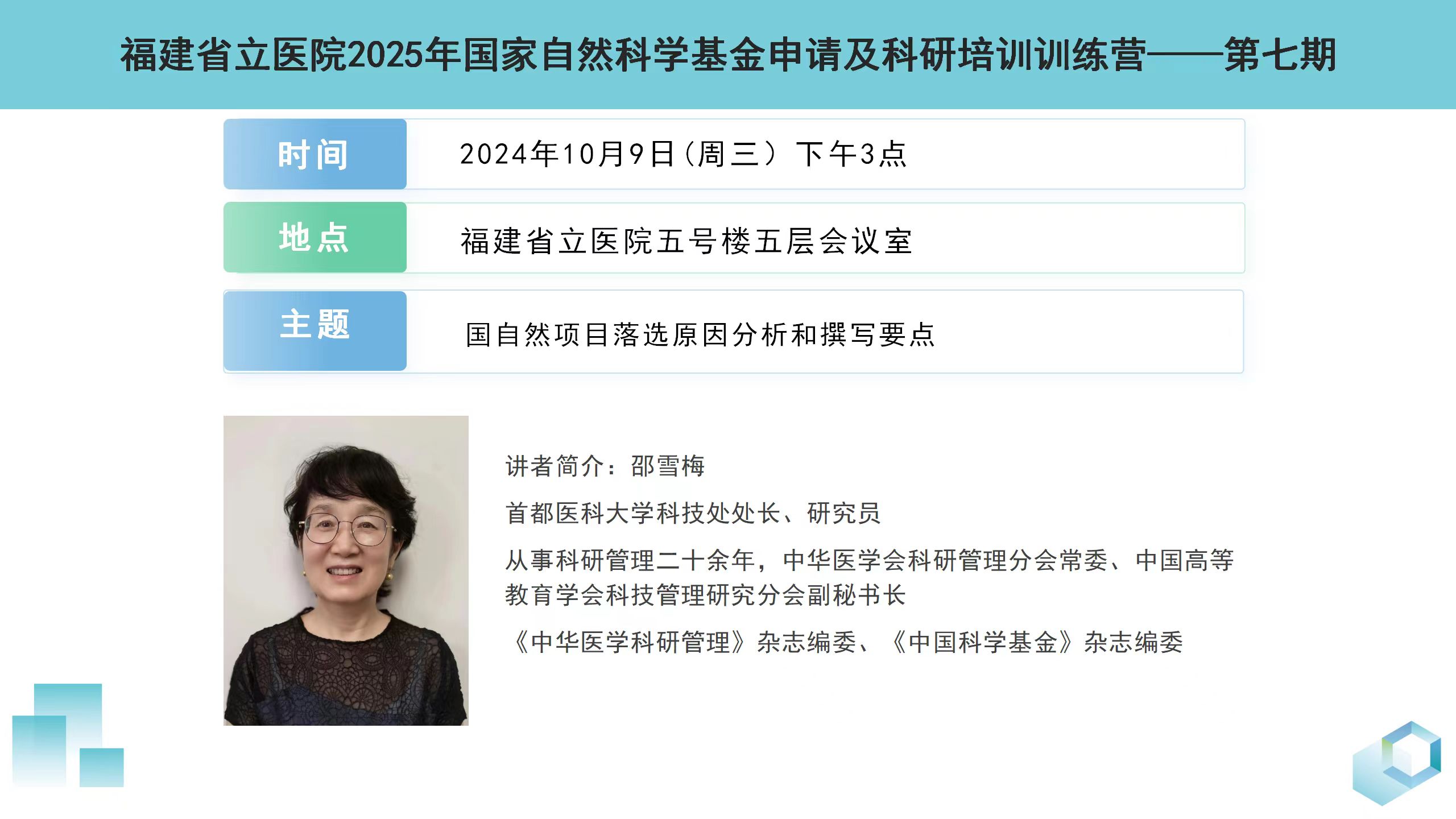 近日,我院科研处在5号楼5层会议室成功举办了第七期2025年国家自然科学基金申请及科研培训训练营。本期特邀讲者为首都医科大学科技处处长邵雪梅研究员,讲座由我院薛富善教授主持。院内相关科研人员积极参与了本次讲座。