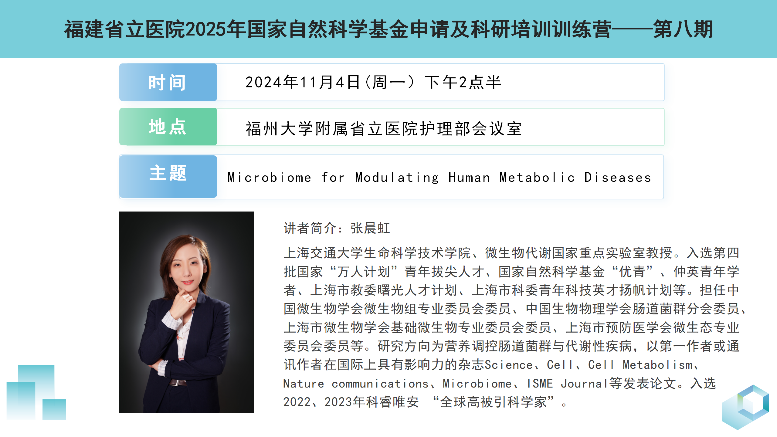 11月4日下午,我院科研处在护理部会议室举办了第八期2025年国家自然科学基金申请及科研培训训练营。本期特邀讲者为上海交通大学生命科学技术学院、微生物代谢国家重点实验室教授张晨虹。讲座由我院科研处处长郑富豪主持,院内相关科研人员参与了本次讲座。