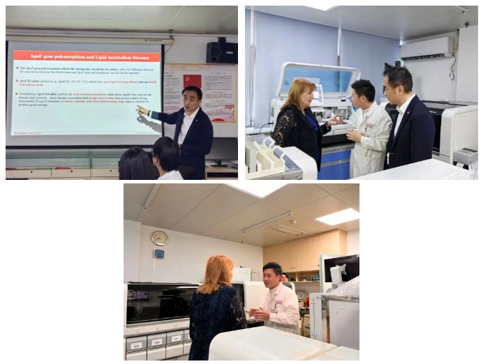 在参观中心实验室时,工作人员向Tomris Ozben教授重点介绍了心血管相关指标的检测设备和检测技术,展示了如何通过精确的检测来评估患者的心血管健康状况,并讨论了如何通过这些检测结果来指导临床治疗决策,以及这些检测技术在心血管疾病预防和管理中的作用。