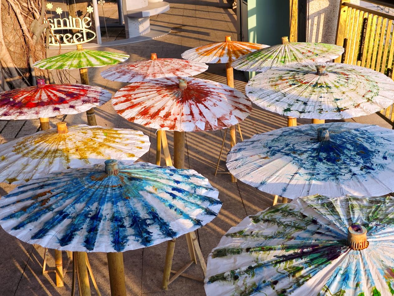 为让非遗技艺在新时代重焕生机,实践队员们大胆创新,在绘制伞面的环节中,将非遗油纸伞与漂漆艺术巧妙融合。漂漆艺术以其独特的纹理和色彩变幻著称,队员们以漆作画,以油纸伞为纸,巧妙地将漂漆技法应用于油纸伞的伞面绘制。绚丽多彩、变幻无穷的漂漆色彩与油纸伞古朴典雅的风格相互碰撞、交融,创作出了一系列兼具传统韵味与现代时尚感的作品,既保留了油纸伞的传统韵味,又增添了现代艺术的灵动与新奇。