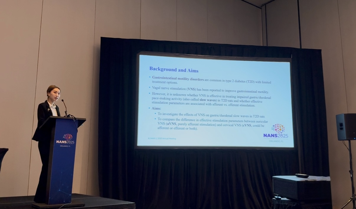 其中,我院康复医学中心兰心雅医生与密歇根大学医学院神经调控实验室主任陈建德教授团队共同开展的研究成果《Parameter-specific effects of VNS on gastrointestinal slow waves in diabetic rats: afferent vs. efferent stimulation》入选大会口头报告,该研究首次验证了迷走神经刺激(VNS)在糖尿病引起的胃肠动力紊乱中的有效性,为未来的临床应用奠定了基础。