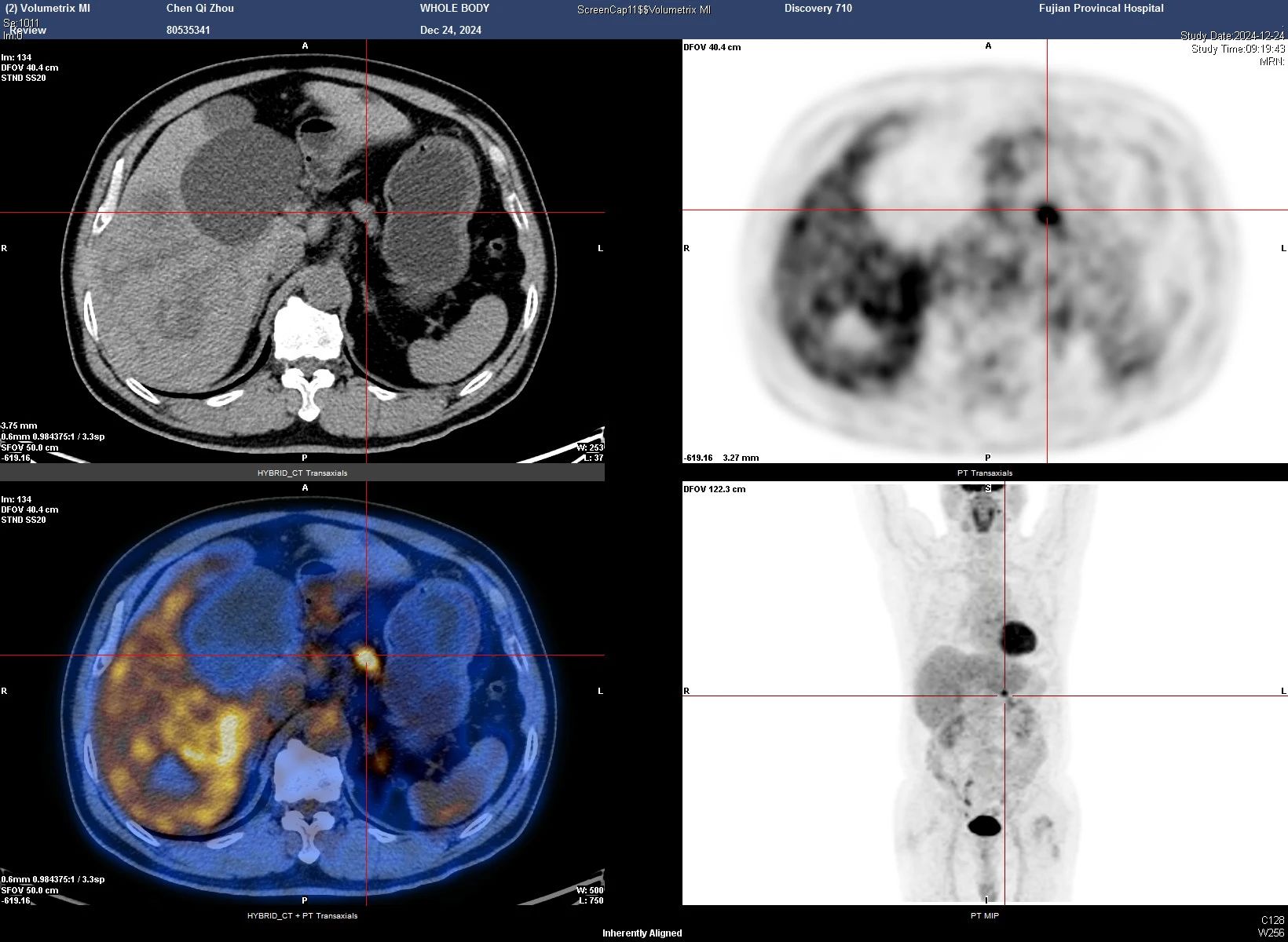 祸不单行,陈老师的术前检查还提示胰腺体部存在 2.5×1.5cm的占位。得益于我院先进的磁共振和PET-CT 检查,精准为外科手术提供了重要依据。这处占位可疑来源于肝癌的转移病灶,肝癌转移到胰腺的情况在临床上非常罕见,文献报道仅占2.7-5.6%。