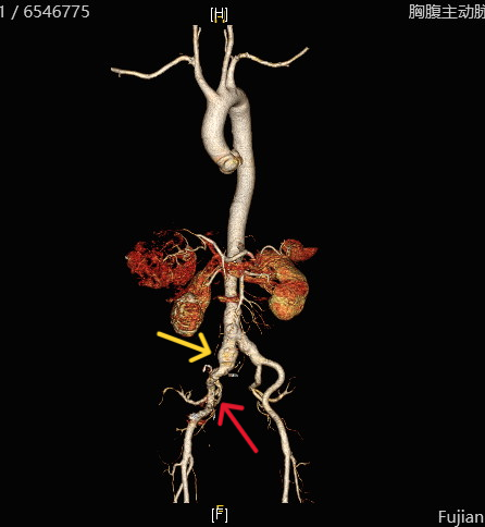 图示右髂总动脉瘤(黄色箭头)及可疑破裂处(红色箭头)