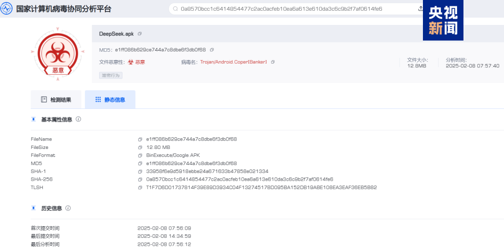 近日,在我国境内捕获发现仿冒DeepSeek官方App的安卓平台手机木马病毒。