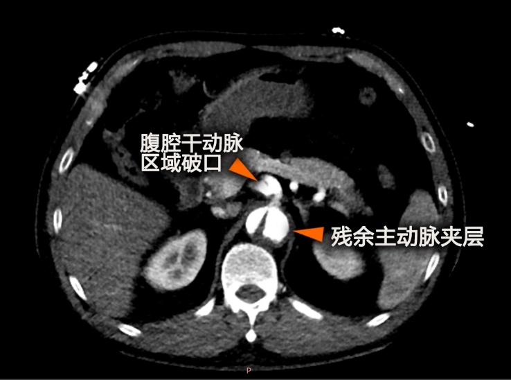 夹层术后残余破口:另外一位51岁男性患者,三个月前胸主动脉夹层术后复查发现支架远端仍有破口,假腔扩大威胁左肾供血,常规覆盖破口会导致器官缺血。