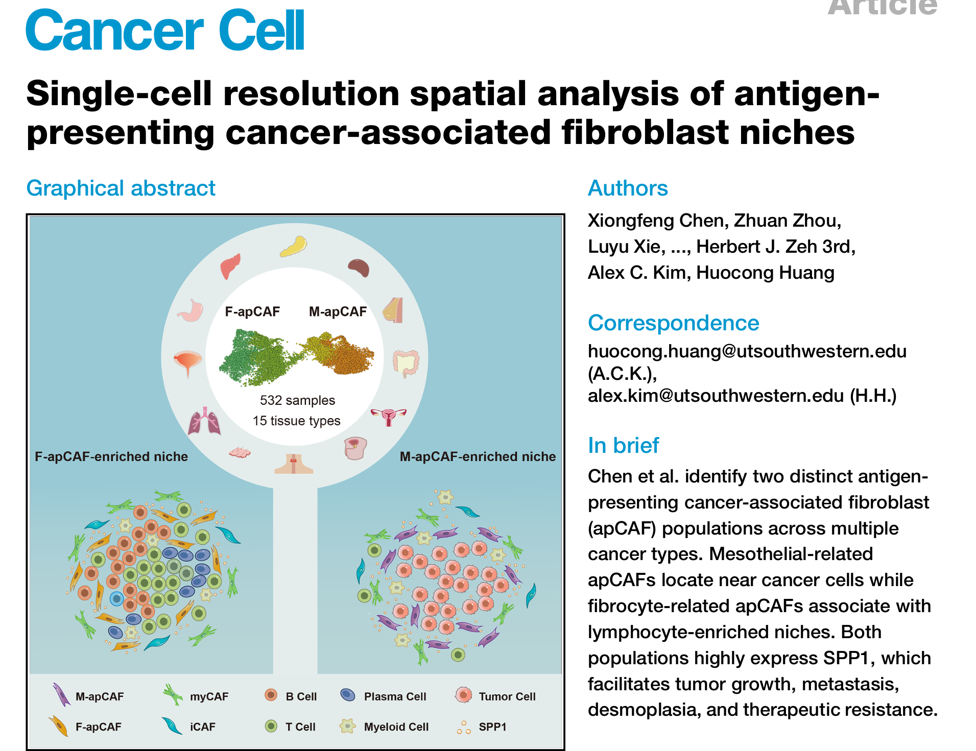 本研究识别出一种独特的癌症相关成纤维细胞(CAF)亚型,称为抗原呈递 CAF(apCAF),这是目前最不为人所知的 CAF 亚型。为了全面了解 apCAFs 的起源和功能,我们构建了跨越 14 种实体瘤的成纤维细胞分子图谱。我们的整合研究揭示了在大多数癌症类型中存在两种不同的 apCAF 谱系:一种与间皮样细胞相关,另一种与成纤维细胞相关。利用高分辨率的单细胞空间成像平台,我们表征了这些 apCAF 谱系的空间生态位。我们发现间皮样 apCAF 位于癌细胞附近,而成纤维细胞样 apCAF 则与三级淋巴结构相关。此外,我们发现这两种 apCAF 谱系都能上调分泌蛋白 SPP1,这有助于胰腺导管腺癌(PDAC)原发肿瘤的形成和结直肠腹膜转移。综上所述,这项研究在分析 apCAF 谱系及其空间生态位方面提供了前所未有的分辨率。