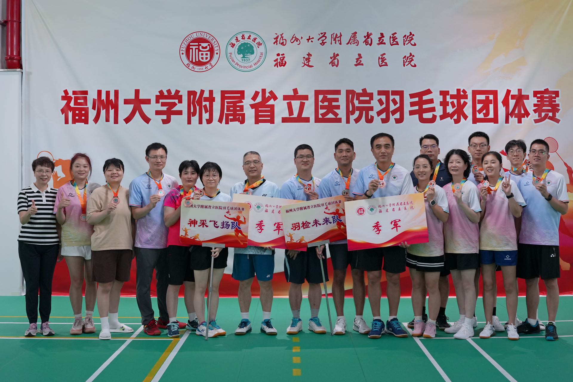 10月19日,福州大学附属省立医院首届羽毛球团体赛在金山院区羽毛球馆成功举办。来自全院八支代表队的近百名选手,以“羽”为媒,在赛场上挥洒汗水、切磋球技,经过激烈角逐,“无影刀锋队”荣获冠军,逗比快乐羽球队获得亚军,羽检未来队与神采飞扬队并列季军。医院党委委员、省急救中心副主任、工会主席叶阿琴为获奖队伍颁奖。