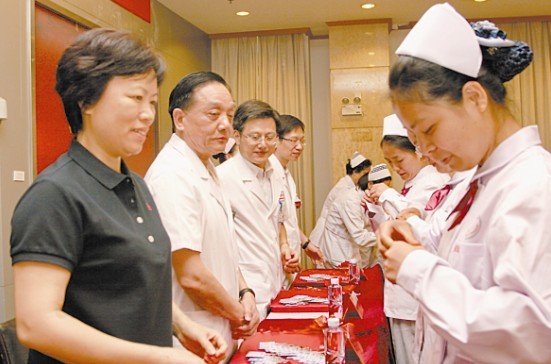 本报讯 7月13日上午,福建省立医院2013年度护理岗位新员工岗前培训结业式在学术厅隆重举行。省卫生厅党组书记、厅长朱淑芳见证了286名新护士戴上圣洁的燕尾帽和标志步入职业生涯的胸卡,寄语白衣天使要信守南丁格尔誓言,忠诚于护理事业,用心感知、主动服务,在平凡的护理岗位上建功立业。