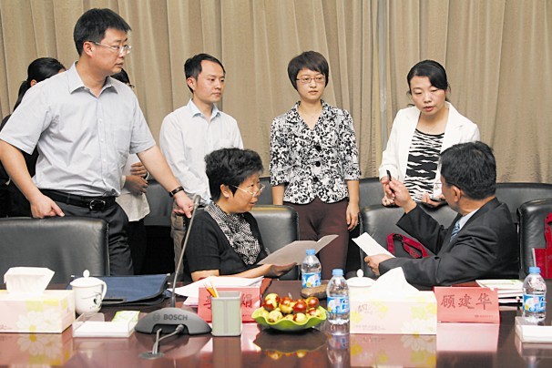 图为国家卫生计生委督导组专家在检查城乡医院对口支援的相关资料。