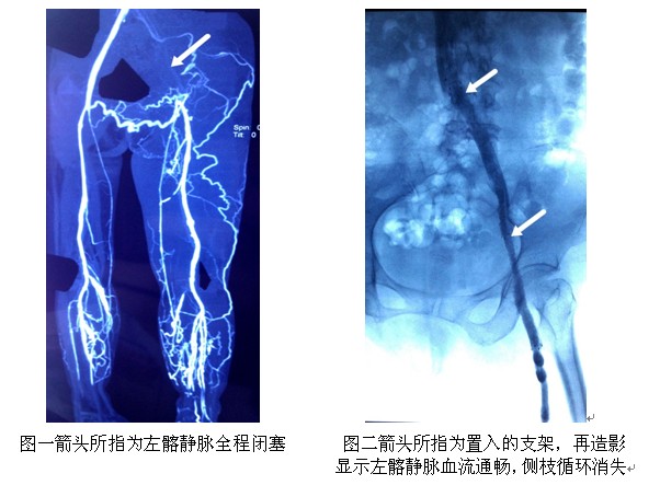 患者唐XX,53岁,以“左下肢肿痛5年,踝部皮肤破溃6个月”为主诉就诊我院心外一科,王沆主治医师询问病史发现该患者6年前曾患左下肢深静脉血栓,当时未予及时治疗,5年前即出现左下肢反复肿痛,久站后尤为明显,6个月前左踝部出现破溃,伴疼痛、瘙痒、流脓,经多方治疗均不见好转,严重影响日常生活。患者入院后,血管外科组的林隆辉副主任和王沆主治医师积极安排患者行血管造影等检查,在检查的过程中双下肢CTV显示其左侧髂总静脉及髂外静脉全程闭塞,再结合其临床症状确认患者诊断为:左下肢深静脉血栓形成后综合征。林隆辉副主任和王沆主治医师制定了详细的手术方案,
