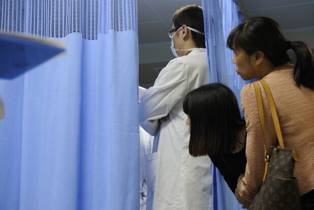 医生会诊,患者家属透过围帘张望。