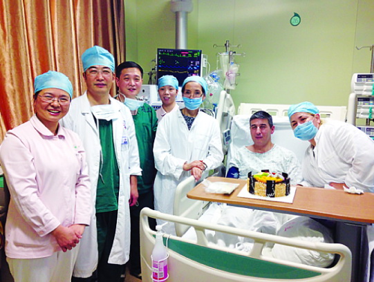 当健谈帅气的Rocha看着大家精心为他准备的蛋糕时,嘴角情不自禁微微上扬,幸福之感溢于言表,用蹩脚的中文一直重复地说:“谢谢!谢谢!”一时间,病房里洋溢着温馨的气氛。此情此景,一直守在Rocha身边的妻子忍不住溢出了感动的泪水。她紧握着大家的手,表达心中最由衷的感谢。虽然他俩只身异国他乡,正经历最惊心动魄的一次生命历程,但中国人民给予他们的爱,让他们在这场没有硝烟的生命战场上信心满满,从未感觉孤单。她说,Dr.Yu、Dr.Lin 精湛的医术和对病人高度负责的态度,令她由衷钦佩,更感动的是林才经院长和朱鹏立书记、副院长也多次通过各种方式转达着关心,有时是亲临病房问候,有时是亲自指挥召集专家会诊,这是全院技术力量的体现,让Rocha一家感受到了省立大家庭的温暖。