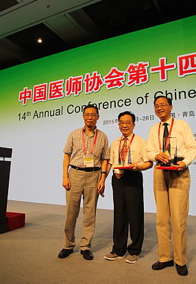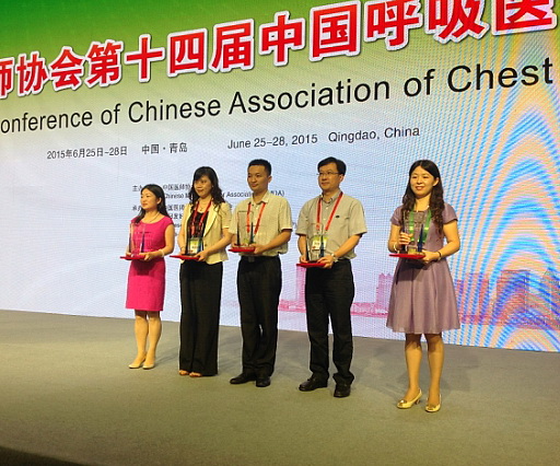 本报讯 为表彰有突出贡献的呼吸科医师,在中国医师协会第十四届中国呼吸医师论坛的开幕式上,举行了隆重的2015年度呼吸医师表彰仪式,我院呼吸科林章树主任医师荣获“终身成就呼吸医师奖”,谢宝松副主任医师荣获“首届全国优秀中青年呼吸医师奖”,颁奖会上钟南山院士及医师协会领导亲临现场给获奖医师颁发荣誉证书及奖杯。(呼吸内科)