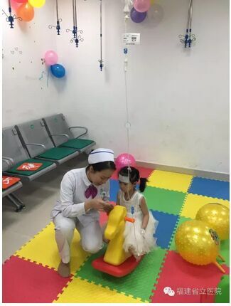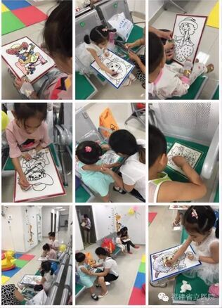 在输液大厅里,许多小朋友一手挂着留置针,一手握着画笔,认真的为自己喜欢的卡通人物填涂色彩,似乎把打针都给忘了!一旁输完液的小朋友,在游戏区一会儿骑小木马、一会儿玩兔兔球,开心的都不愿意回家了!输液厅的护士们也对家长们开展了使用留置针的健康宣教。