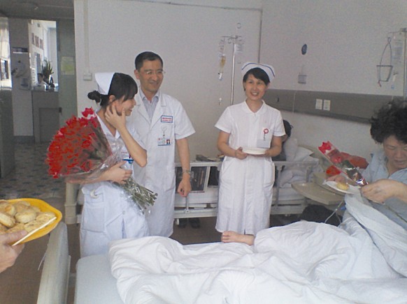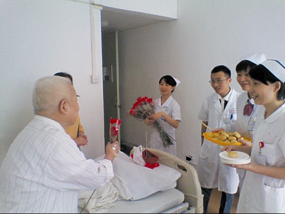 一个小时后,第一盘月饼取模完毕,在膳食部徐开兰部长的支持下,借用膳食科烤箱烘烤,很快第一盘自制月饼新鲜出炉,扑鼻的香味扑满病区。在侯建明主任、陈刚副主任和林娟护士长的带领下,专科护士李玉娥、责任护士林丽娜、聂志春与其他护士、实习同学一同走进病房送月饼、赠玫瑰,爱心传递。每走到一位病人面前,护士长都耐心地向病人解释无糖月饼是专门为糖尿病病人制作的,可以放心品尝,并指导病人如何与午餐进行交换份换算。每一位病人接过月饼和鲜花时,无不感到惊喜和激动,“多少年了,我竟然还能吃上月饼。”这是许多糖尿病病友们蓄积已久的心声。当大家走进19床病房将月饼和鲜花送到病人手中时,病人和家属热泪盈眶,19床是前一天刚住院的病重病人,由于病情较重,又逢中秋佳节,夫妇俩正皱眉沮丧,这突如其来的爱心问候和温馨祝福让他们又惊又喜,能看得出他们不善表达,却能深深体会到他们内心的感激和感动,不论是对病人还是对医护人员,这一瞬间的画面将成为永恒的回忆和鼓舞。