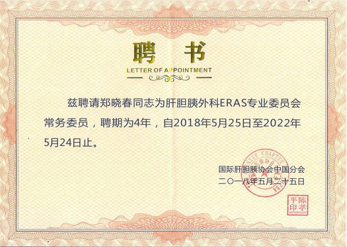会上,国际肝胆胰协会中国分会成立了肝胆胰外科ERAS(加速康复外科)、胆道肿瘤、胆道结石、肝胆胰MDT、儿科等5个专业委员会,我院郑晓春教授当选为肝胆胰外科ERAS专业委员会常务委员。