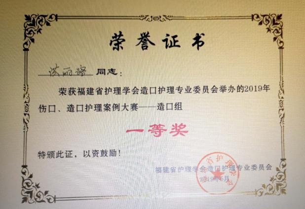 5月21日,首届福建省护理学会伤口、造口护理案例大赛在莆田举行,我院整形烧伤科国际造口治疗师曾碰华主管护师《一例海分枝杆菌感染伤口的护理》获伤口组一等奖,25区洪丽溶护师《一例造口旁疝的护理》获造口组一等奖。
