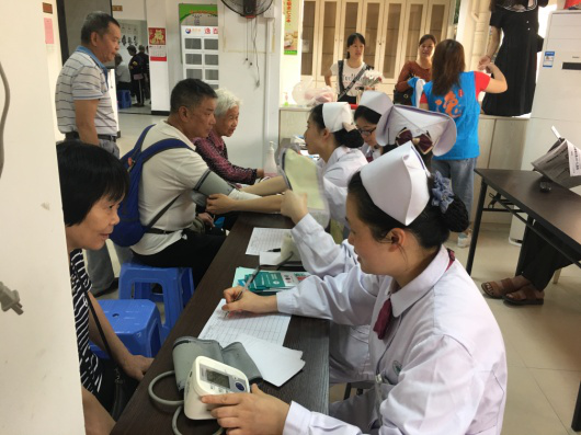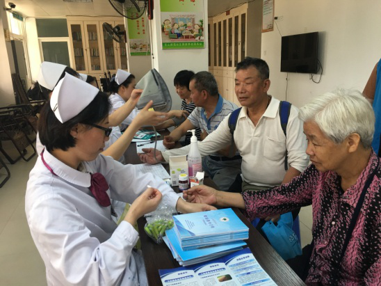 专科护士们还来到金洲社区,为80余名社区居民监测血压血糖,指导糖尿病患者饮食和运动,科普糖尿病并发症的相关知识;专程走访患者家庭,发放爱心注射包,倡导安全注射理念。