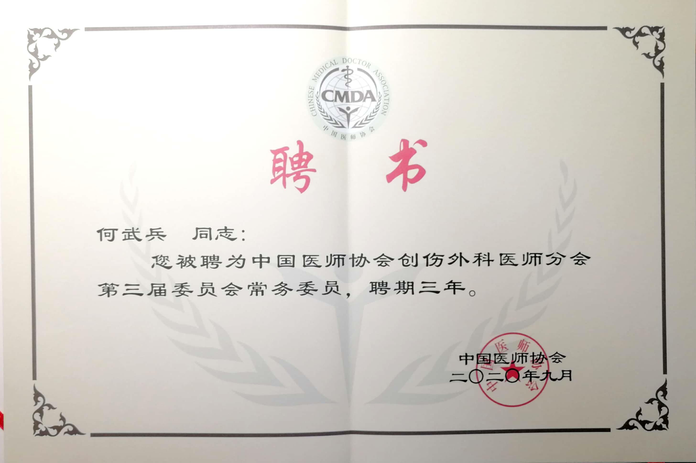 近日,中国医师协会创伤外科医师分会开展第三届委员会换届选举,我院急诊外科副主任何武兵主任医师当选分会常务委员。