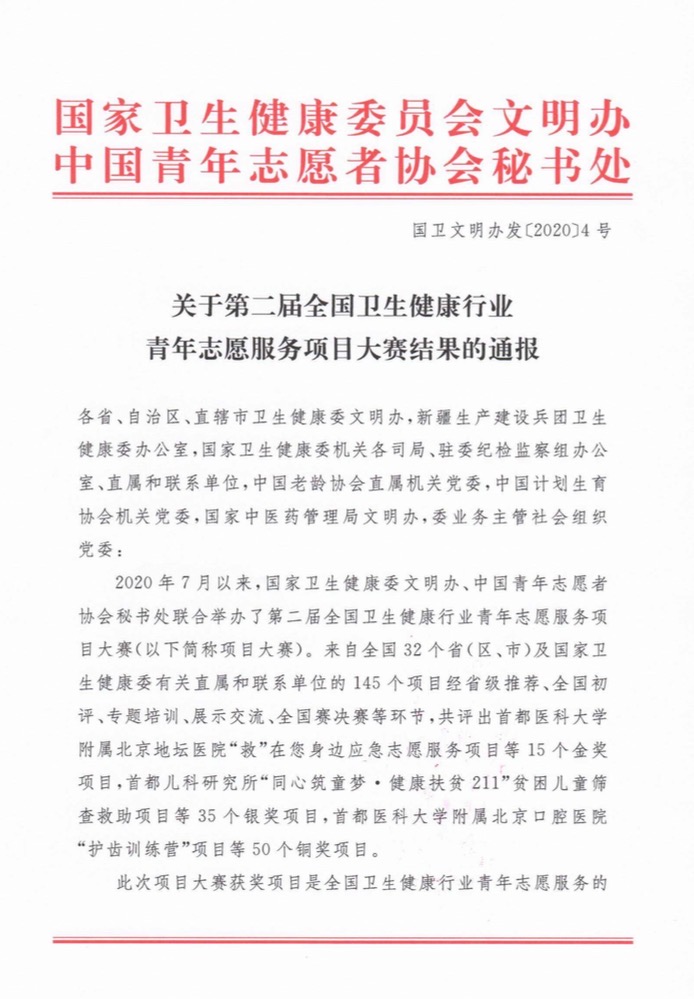 日前,第二届全国卫生健康行业青年志愿服务全国赛决赛暨展示交流活动在北京举行。大赛由国家卫生健康委文明办、中国青年志愿者协会秘书处联合举办。来自全国32个省(区、市)及国家卫生健康委有关直属和联系单位的145个青年志愿服务优秀品牌项目,以“汇聚卫生健康文明力量,绽放蓬勃青春志愿之花”为主题,通过路演视频形式参赛并进行展示交流。我院宁养志愿服务项目《传播安宁疗护志愿精神·陪伴患者走完生命幽谷》获得铜奖。