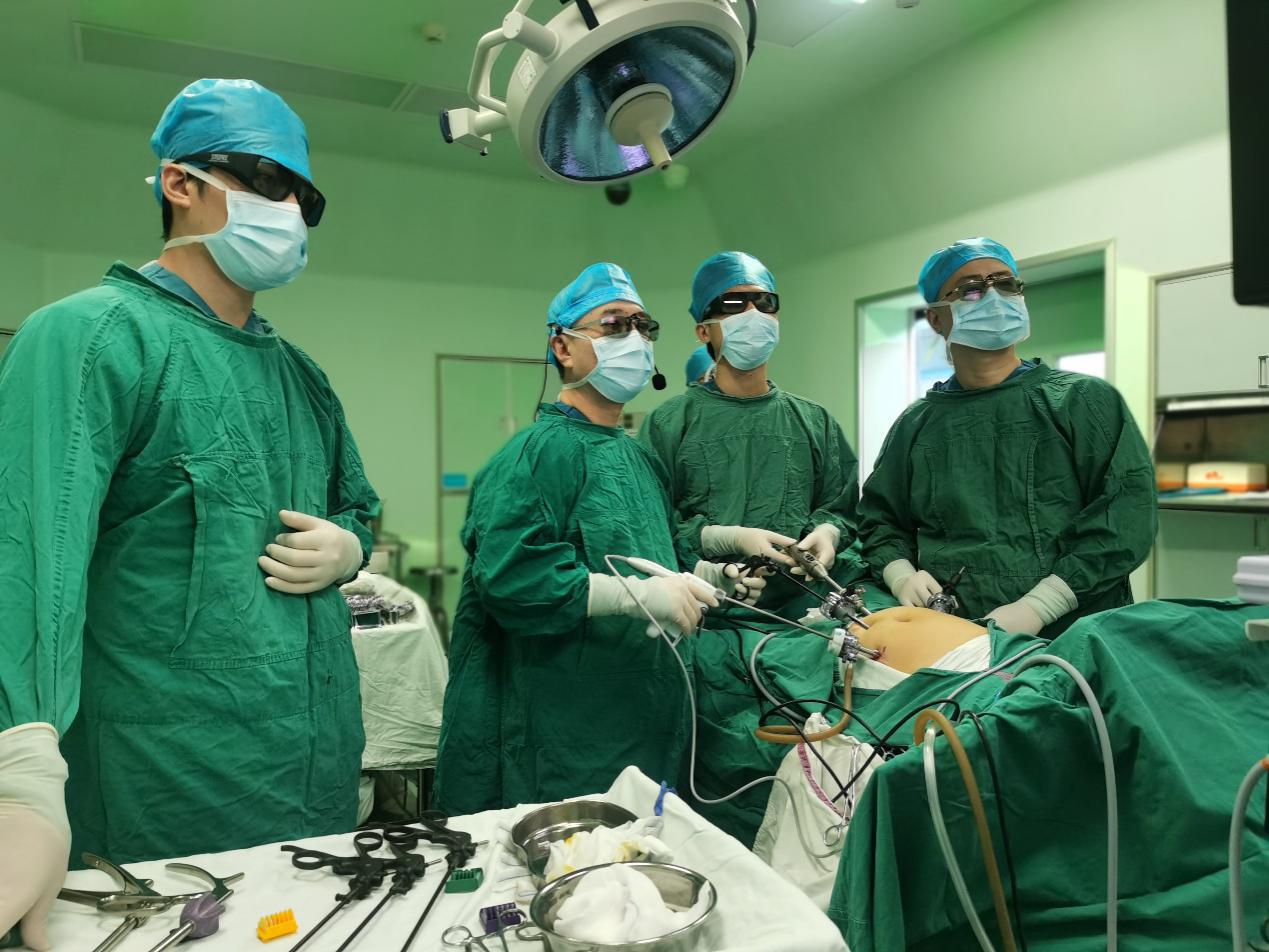 ▲肖毅教授进行“腹腔镜下扩大右半结肠根治性切除术”