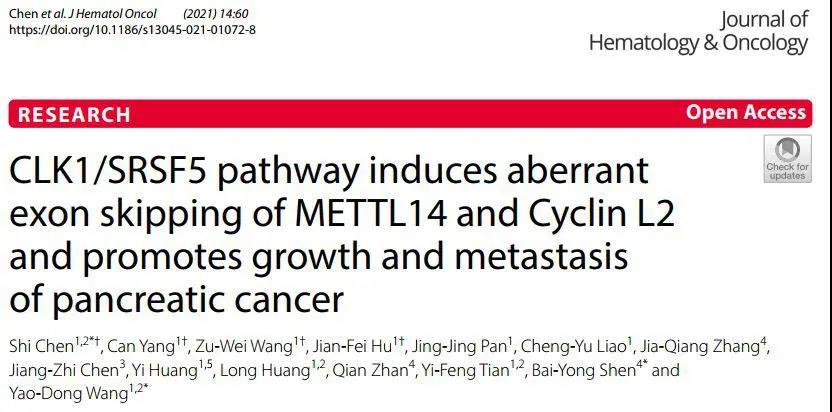 该论文题为“CLK1/SRSF5 pathway induces aberrant exon skipping of METTL14 and Cyclin L2 and promotes growth and metastasis of pancreatic cancer”,课题在王耀东教授指导下历时3年完成。《Journal of Hematology & Oncology》是BMC杂志社旗下的王牌期刊之一,属于医学 1 区(中科院1区,JCR1区),2021年即时影响因子突破16.57,该期刊主要发表肿瘤学方面的高质量论著。福建省立医院为本研究项目第一完成单位,由国家自然科学基金和福建省自然科学基金杰出青年项目资助。