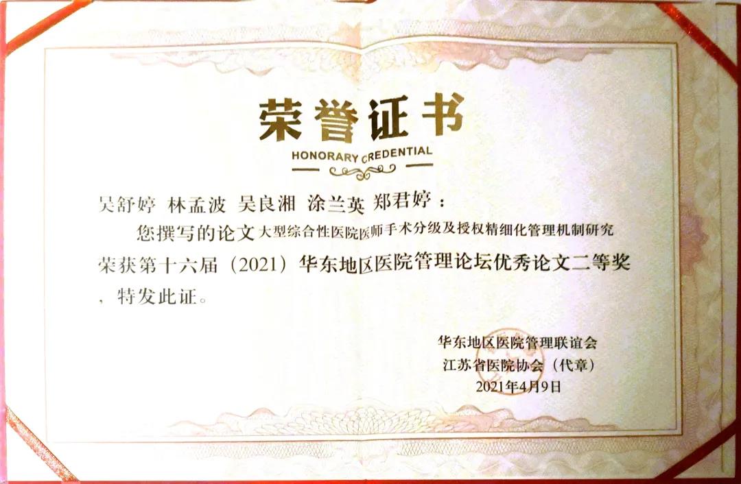 ● 《大型综合性医院医师手术分级及授权精细化管理机制研究》获得优秀论文二等奖