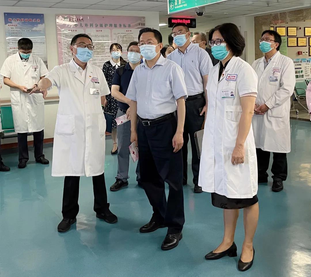 许树强司长一行深入实地考察了儿外科病房、门诊、院史馆和党建文化长廊、医务社工与志愿者服务站、城市核酸检测基地等,详细了解医院党建、运行管理、学科建设、改善医疗服务、信息化建设以及文化建设等工作的开展情况,认真听取了医院党委书记、院长朱鹏立关于深化综合改革、完善运行机制、强化公益责任等方面的工作汇报。
