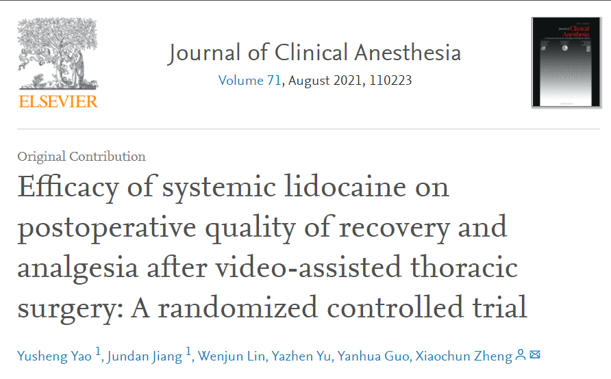 近日,在郑晓春教授的指导下,以我院麻醉与围术期临床医学中心姚玉笙博士为第一作者的科研成果“Efficacy of systemic lidocaine on postoperative quality of recovery and analgesia after video-assisted thoracic surgery: A randomized controlled trial”正式刊发在国际麻醉学领域排名第一期刊《Journal of Clinical Anesthesia》(JCR分区Q1,影响因子9.452)。