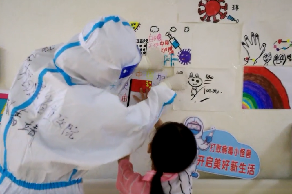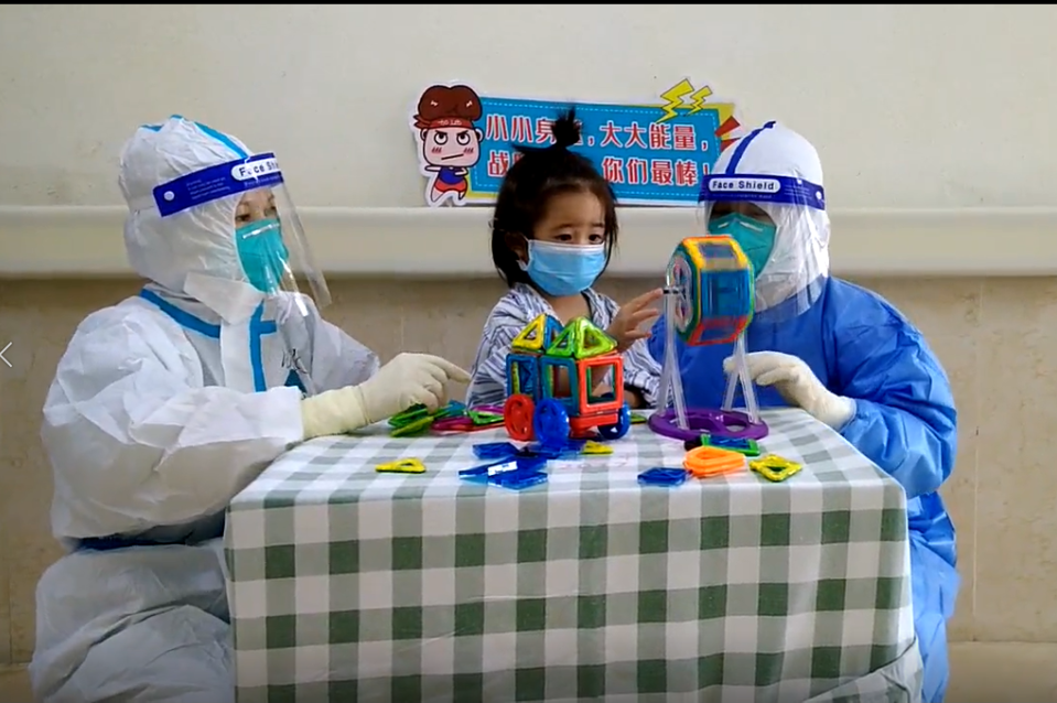 为了更好地照顾儿童患者,隔离病区内设置了2个儿童病房,护士们纷纷充当起孩子们的“临时妈妈”,不仅负责孩子们的治疗护理,还给他们喂饭、梳头发,陪他们聊天、做游戏,儿童心理专家也及时给予孩子们心理疏导,缓解孩子的紧张、分离焦虑等情绪,让他们安心地接受治疗。