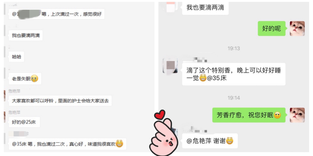 “听护士说带来精油,让我闻一闻感受下植物的味道,我有点好奇,就试了一下,那天晚上,伴着植物的香气,我觉得很好入睡,也睡得踏实了。”连续失眠两天的28岁患者小余(化名),终于重拾了安稳的睡眠,高兴的在微信群里跟大家分享。