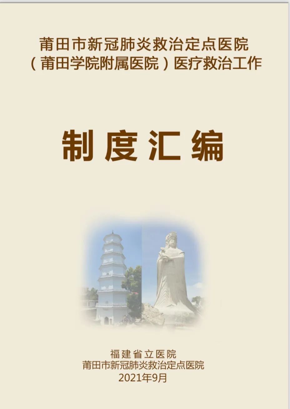 为不断更好地规范落实新冠肺炎疫情防控各项救治工作,医疗队一入驻定点医院就着手建章立制。在国家和省级专家指导下,以国家疫情防控部署和最新诊疗方案为依据,结合定点医院实际情况,对300多项日常工作中存在的问题进行持续改进,形成制度和流程,经过汇总和修订,整理成6万多字102项《莆田市新冠肺炎救治定点医院(莆田学院附属医院)医疗救治工作制度汇编》,其中包括医疗管理15项、护理管理56项、院感管理16项以及后勤管理15项。制度颁布后,组织各医疗队和相关工作人员认真学习,要求贯彻落实,极大的推动了定点医院救治工作的制度化、流程化和同质化。