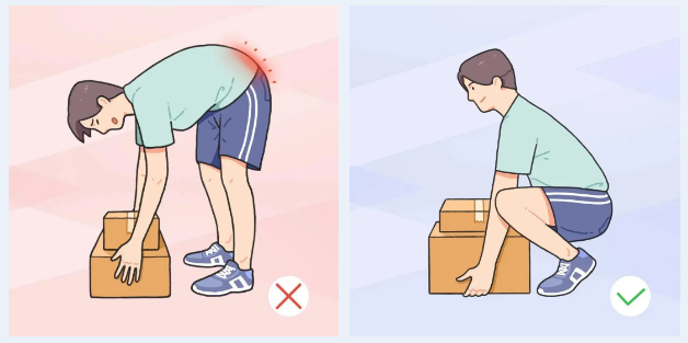 ④尽量少搬重物,不得不搬重物时应下蹲,膝关节屈曲将物体尽量靠近身体,并使腹肌维持紧张,以保护腰部较弱的肌肉,防止拉伤。