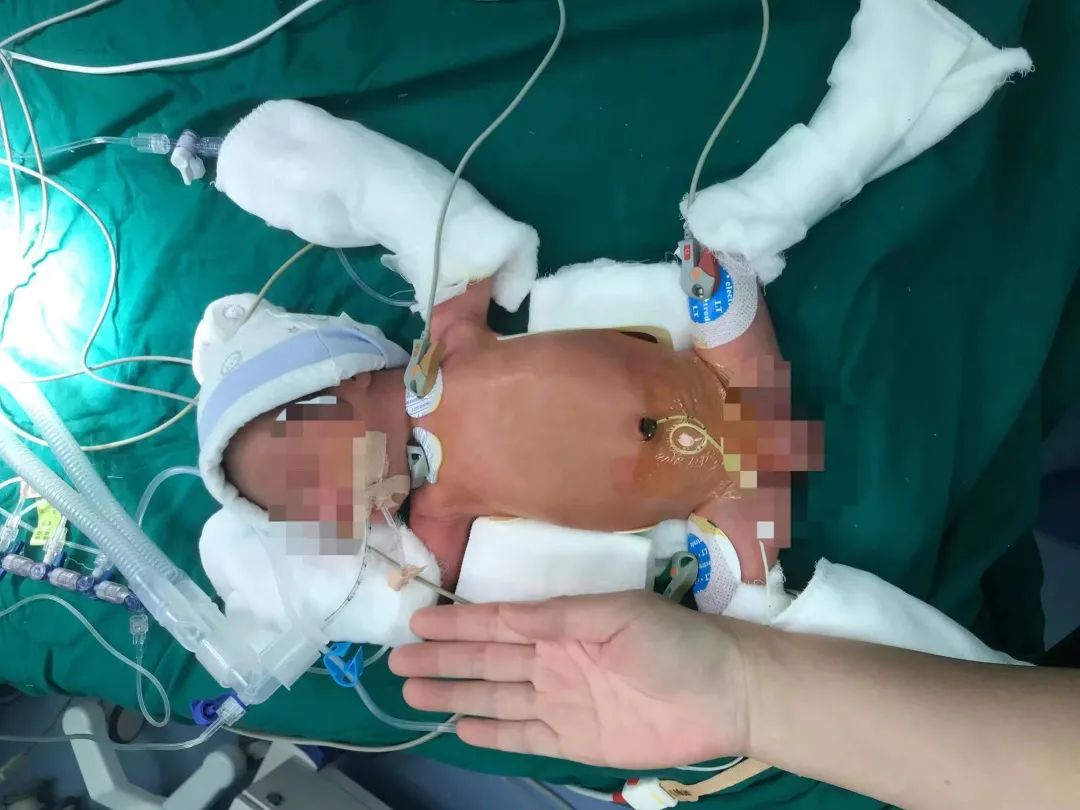 不料,在郭女士孕33周时,突然腹痛难忍,早产生下凡凡。出生时,凡凡的体重仅1.7kg,仅巴掌大小,要想对这个只有巴掌大的早产儿进行外科手术,难度不言而喻。