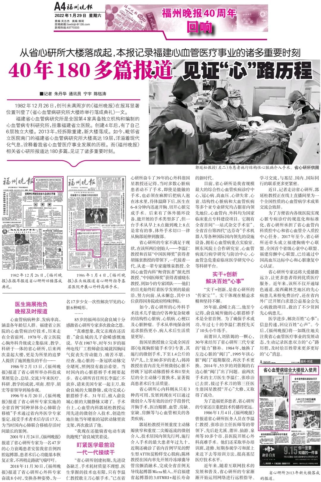 研究所从筚路蓝缕、深厚积淀,到如今的跃动腾飞和开拓创新,为了患者健康不遗余力,为了技术进步不懈追求,令人感动的故事、一些精彩的瞬间,历经风雨洗礼历久弥新。2022年1月29日,《福州晚报》在40周年回响专栏中专题报道:“从省心研所大楼落成起,本报记录福建心血管医疗事业的诸多重要时刻——40年180多篇报道 见证“心”路历程”。