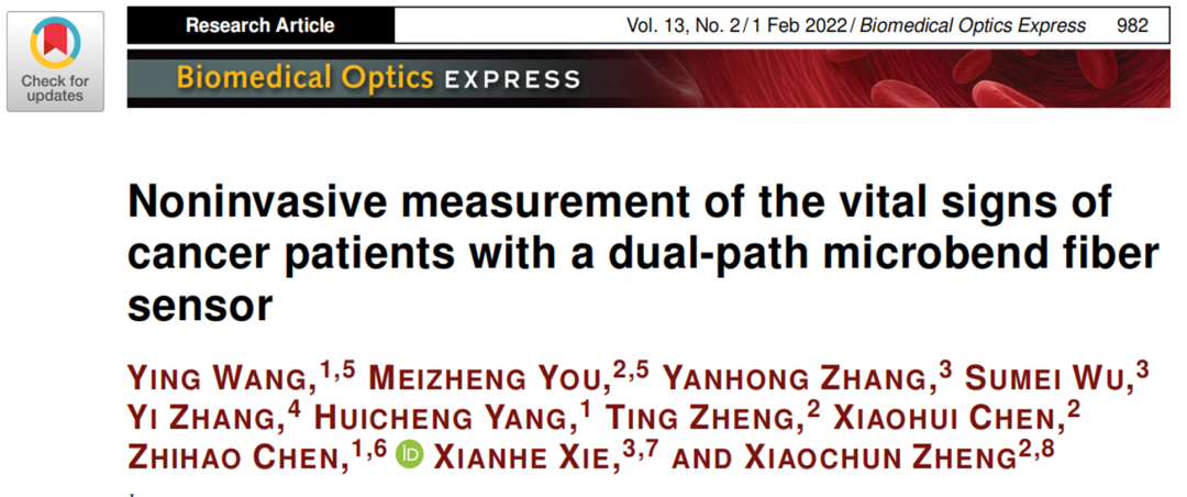 近日,福建省立医院麻醉与围术期临床医学中心郑晓春教授以通讯作者在SCI期刊《Biomedical Optics Express》(中科院分区1区)上发表学术论文“Noninvasive measurement of the vital signs of cancer patients with a dual-path microbend fiber sensor”,标志着我院麻醉与围术期临床医学中心在医工结合科研领域取得新进展。该项研究由福建省立医院麻醉与围术期临床医学中心及泉州师范学院光子技术研究中心共同合作完成。