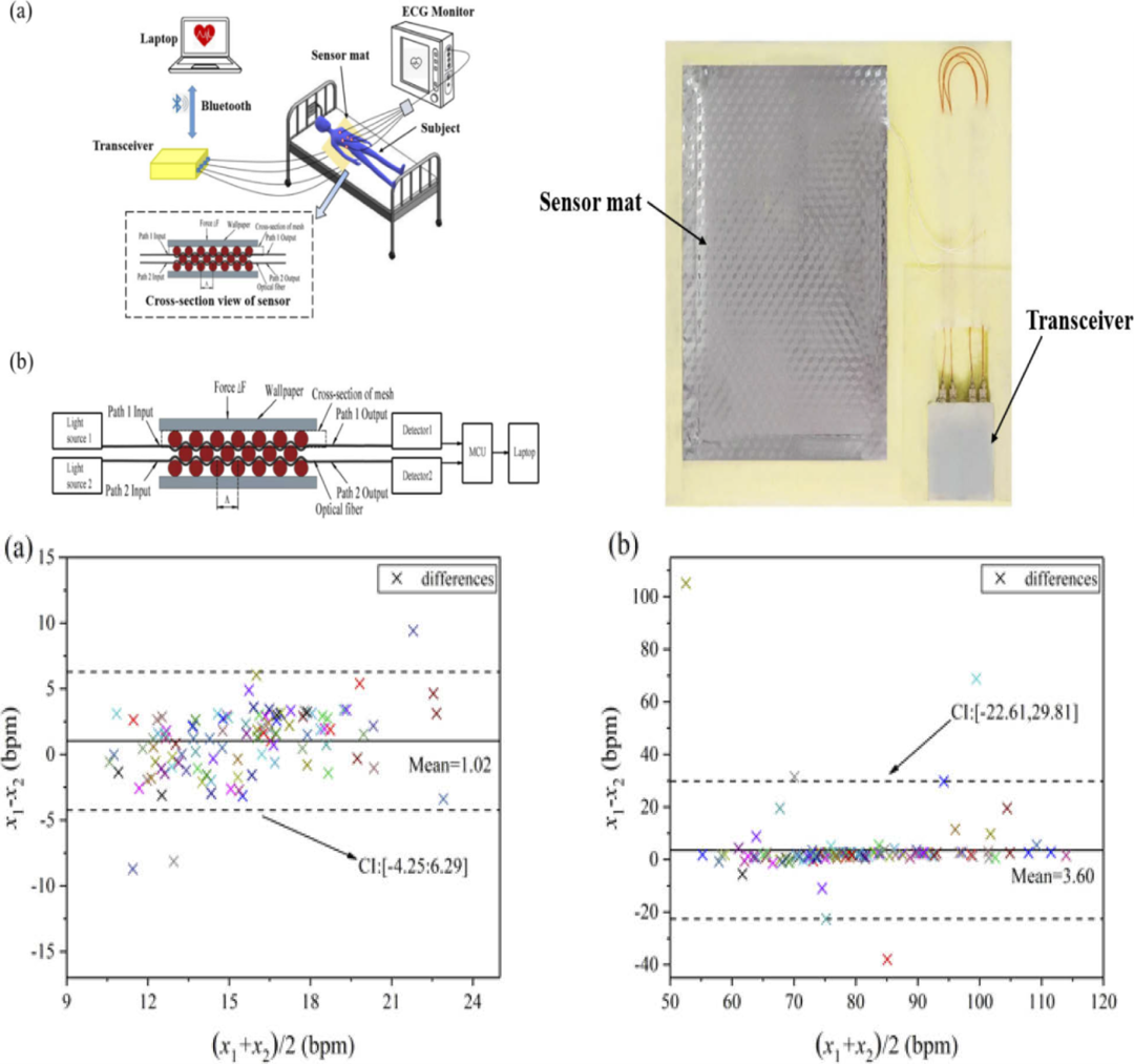 该研究将一种新型微弯光纤传感器用于测量患者的呼吸频率和心率。将光纤传感器放在床垫下,所有患者均接受常规及光纤传感器的临床生命体征监测。该研究结果表明,光纤传感器测量的呼吸频率与医用监护仪测量的结果具有良好的一致性。该微弯光纤传感器与常规监护仪相比,具有无创、无感监测、实时连续监测及易于制造等优点。