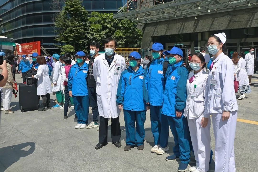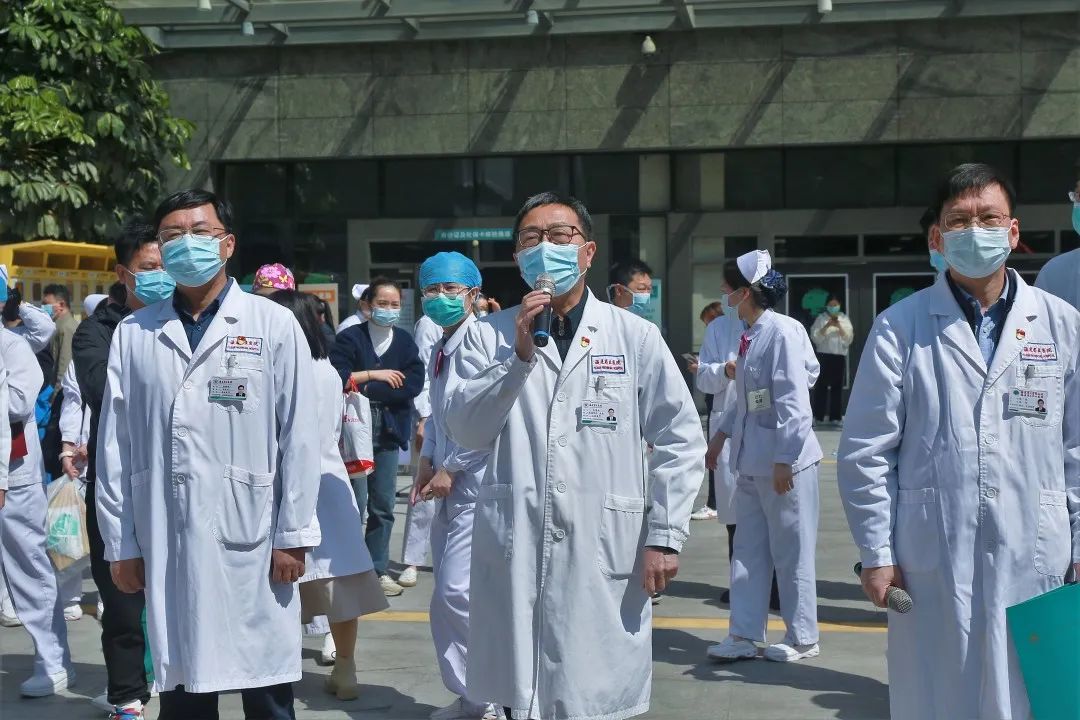 在医院广场,举行了简短而庄重的出征仪式。院领导郑铭主持仪式,全体在家院领导以及员工代表为援沪医疗队出征加油鼓劲。