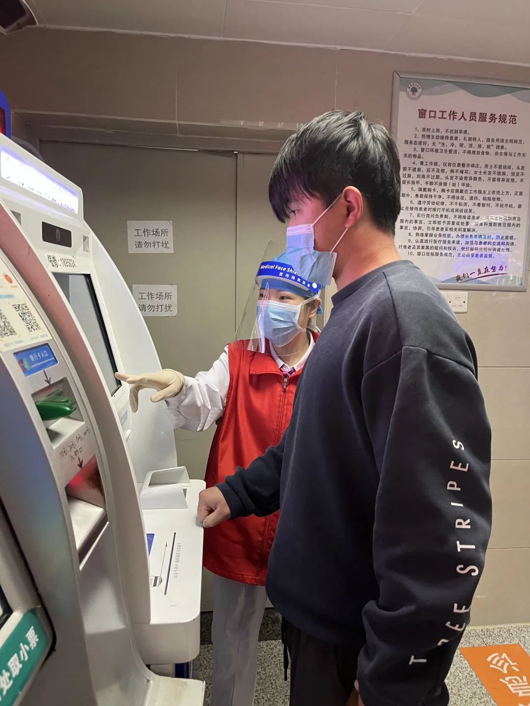 在门诊大厅,我努力帮患者解决就医各类流程上的小问题,指引方向、自助结算、回答咨询等,收获了他们一句句“谢谢”和满意的微笑!
