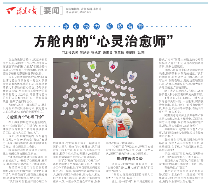 这面心愿墙是来自福建省立医院的唐晓燕、陈倩倩和余冬英的创意。“我们的初衷是,让患者把自己的心语心愿写出来,张贴在墙上。通过这面墙倾诉心声,达到心理疏导的作用,给大家更多的正能量。”唐晓燕说。