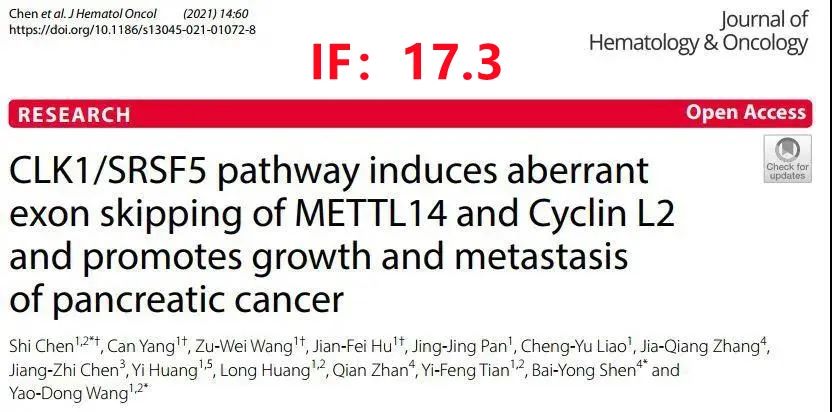 陈实教授团队耗时3年在国际上首次揭示了CLK1-SRSF5轴促进胰腺癌发生发展,为胰腺癌治疗提供新的线索,该论文发表在JCR1区顶刊《Journal of Hematology & Oncology》上,影响因子达17.3。